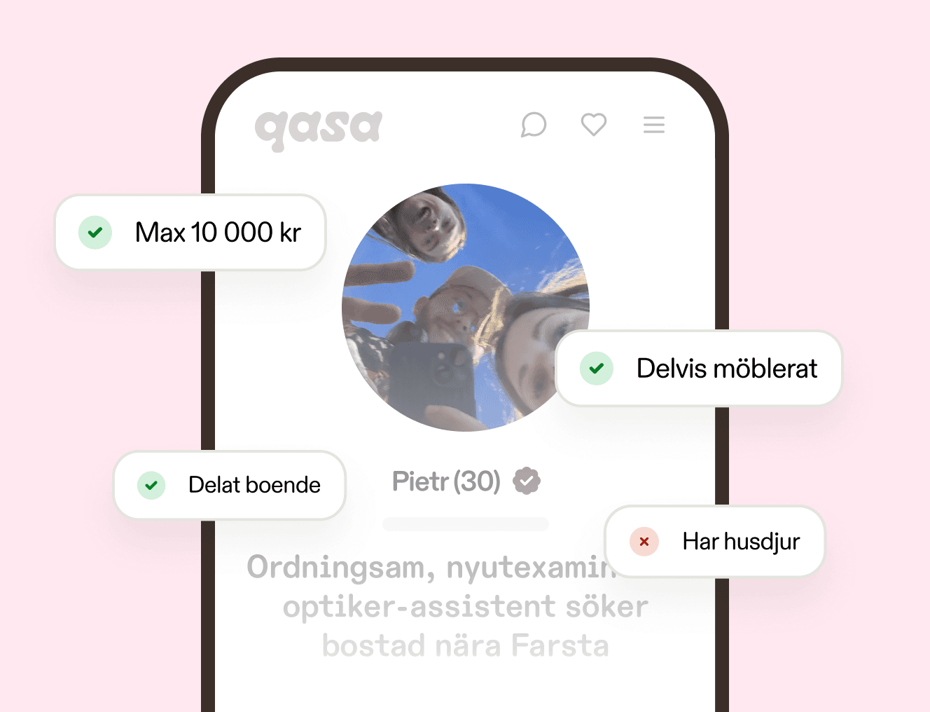 Vänta inte på att rätt person ska hitta dig. Bläddra bland verifierade hyresgästsprofiler som matchar ditt hem och starta en direkt konversation. Du är alltid i förarsätet.
